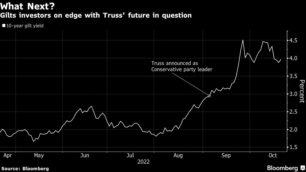 Easing rate hike bets helped offset the impact of ongoing chaos in Westminster, where Truss is meeting the official in charge of leadership votes. While her tenure has largely been rejected by markets so far, her departure could plunge the UK into more turmoil if it were to come before Oct. 31, when the government is due to set out its medium-term fiscal plan.