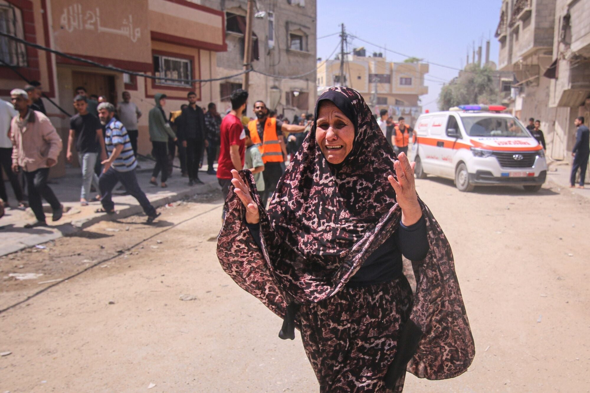 A Palestinian woman reacts to an Israeli strike on Bureij refugee camp in the central Gaza Strip on Monday, April 22, 2024. The Israeli military said the head of its intelligence division quit over the failure to prevent the Oct. 7 invasion by Hamas, an attack that left about 1,200 dead and triggered the ongoing war in Gaza. Photographer: Ahmad Salem/Bloomberg