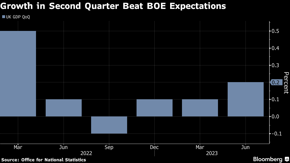 Gross domestic product rose 0.2% from the first quarter, the biggest increase since the start of 2022, the Office for National Statistics said Friday. The Bank of England had expected a 0.1% expansion. Output in June jumped 0.5%, more than double the 0.2% pace expected by economists.