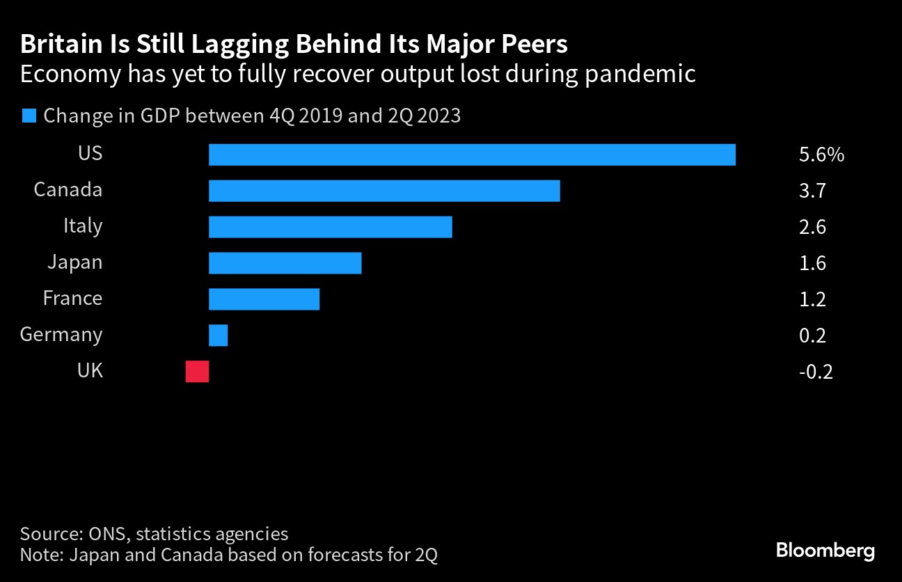 The UK remains the only Group of Seven country that has yet to fully recover from the pandemic, with output last quarter 0.2% below its level at the end of 2019.