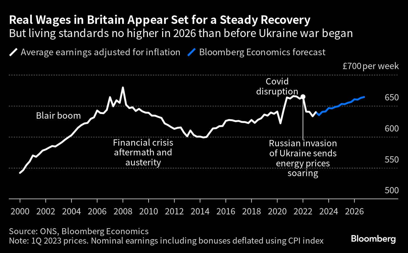 Bloomberg Economics predicts a yearlong recession starting at the end of 2023. While shallow in historic terms, the downturn would keep GDP below 2019 levels until 2026. Others are less pessimistic.