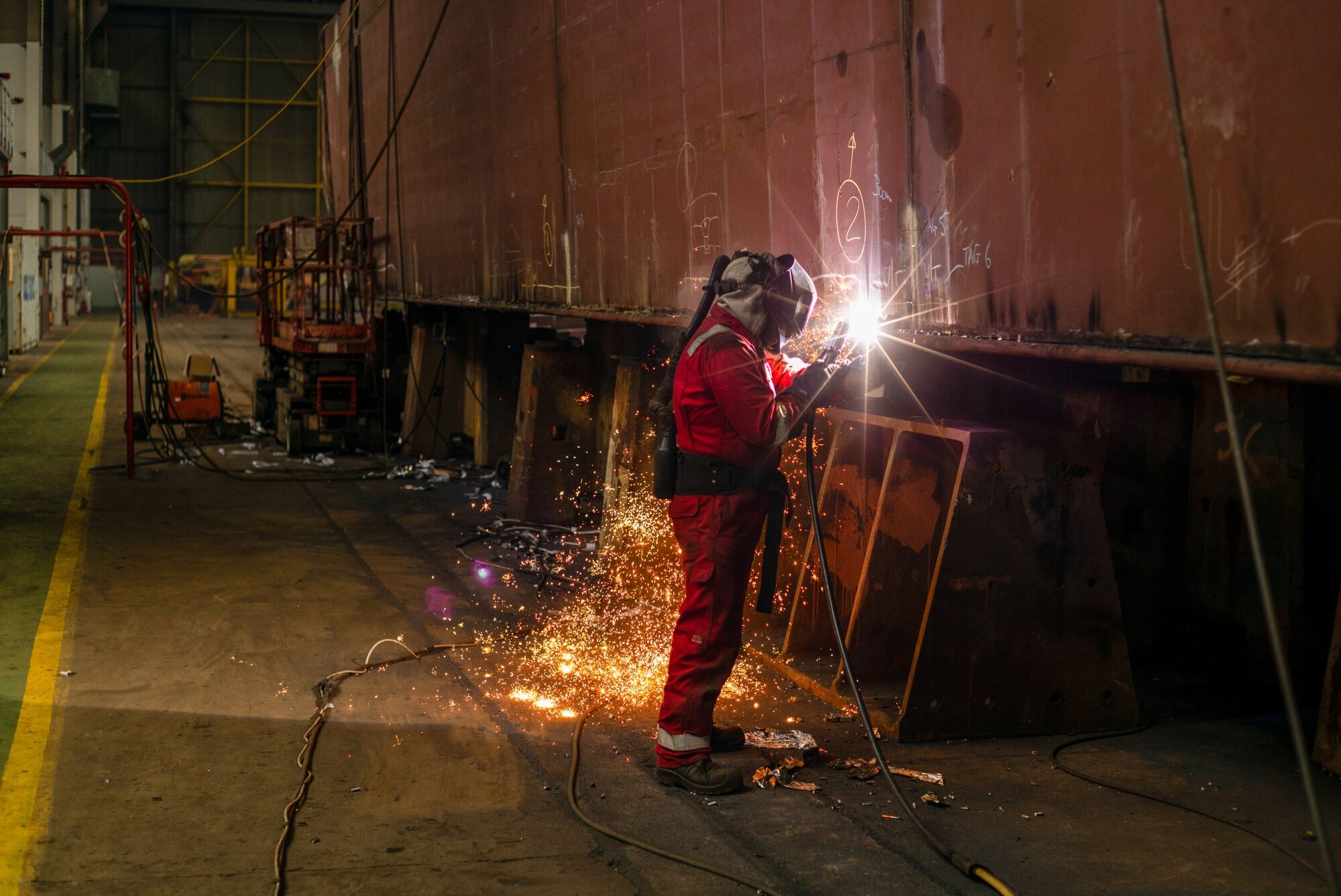 A welder works on a barge under construction in Belfast. Photographer: Paulo Nunes dos Santos/Bloomberg