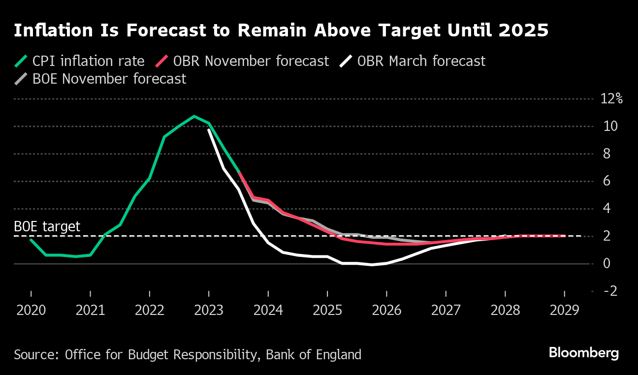 Inflation fell to 4.6% in October, allowing Prime Minister Rishi Sunak to claim victory on his goal of halving inflation over 2023. That has spurred investors to bet that the BOE will start cutting rates next year, something BOE Governor Andrew Bailey has said he's not yet considering.