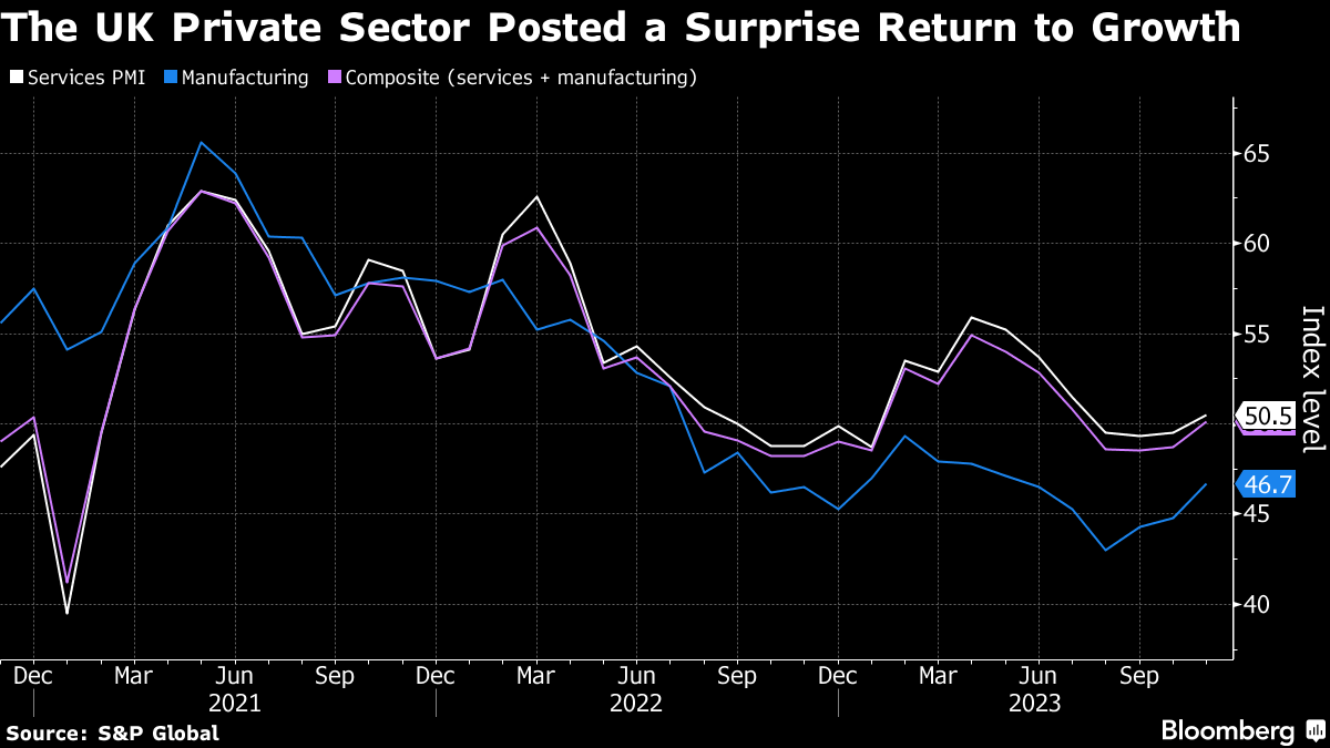 British companies reported an unexpected increase in output in November and evidence of stronger inflation, signs of strength in the economy that may concern the Bank of England. S&P Global said its purchasing managers' index edged up to 50.1, the highest reading in four months and above the threshold level of 50 dividing growth and contraction. It was up from 48.7 in October, a figure economists had expected would be repeated.The data indicate resilience in the economy that may ward off the