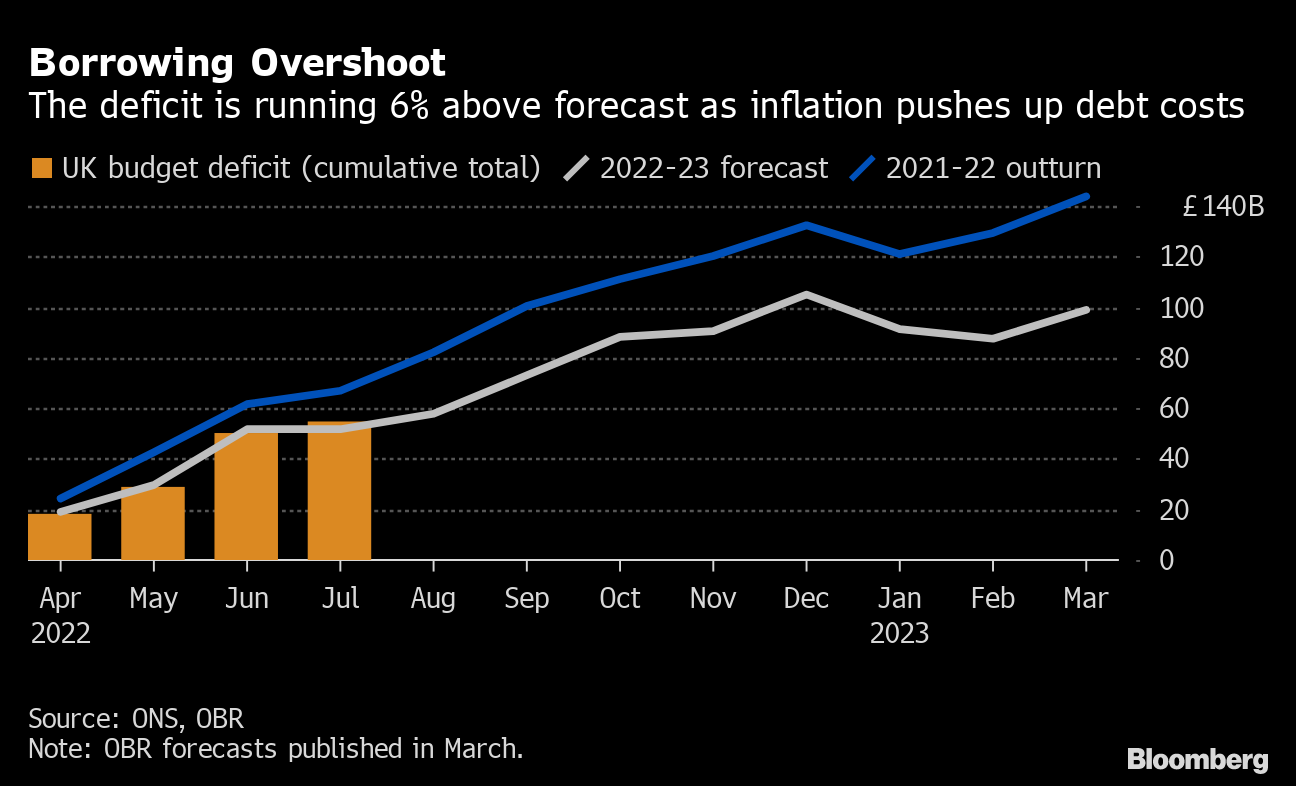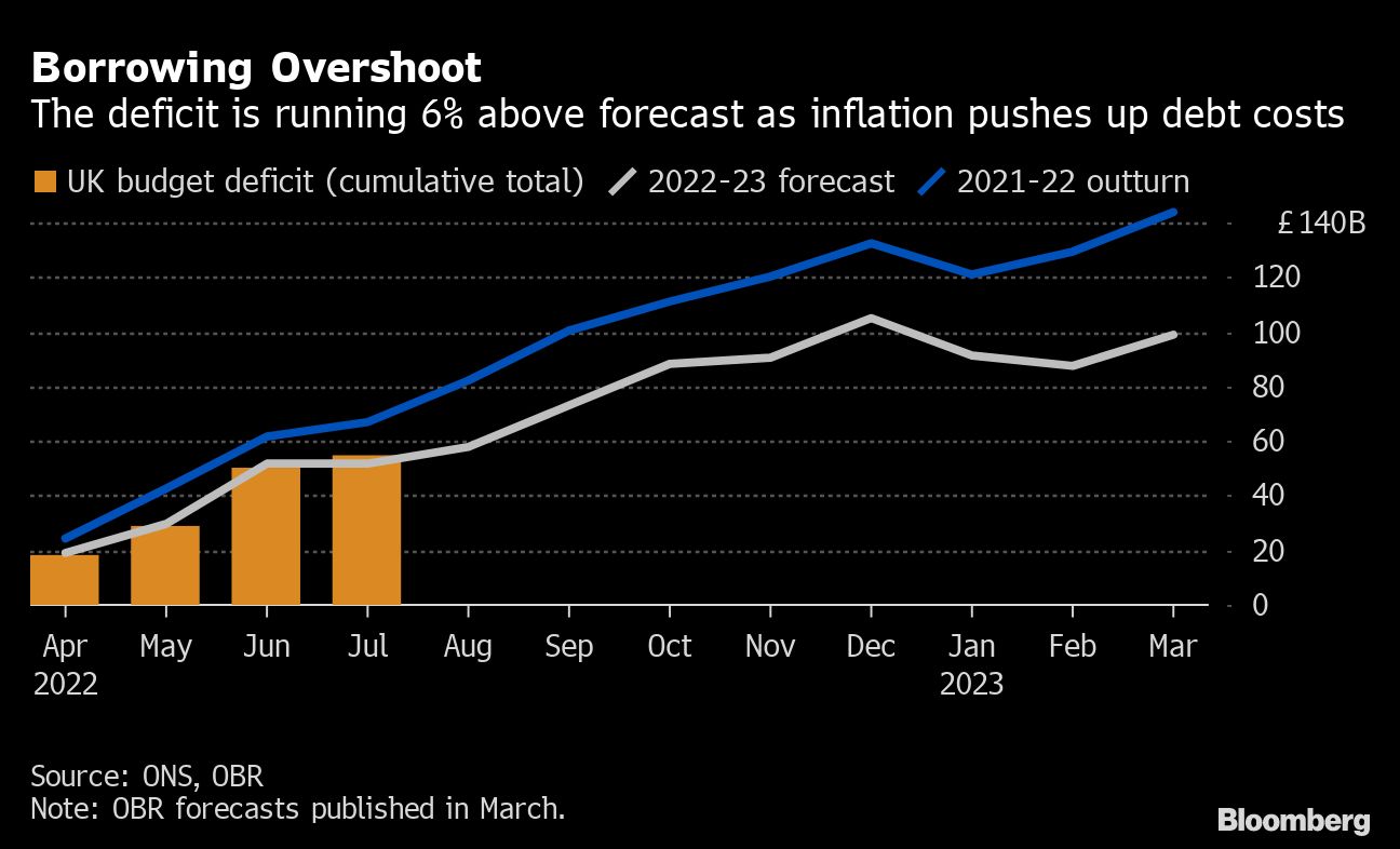 A larger-than-forecast £4.9 billion ($5.8 billion) budget deficit in July took the total for 2022-23 so far to £55 billion pounds -- £3 billion more than officials forecast in March. Debt-servicing costs surged by 81% from a year earlier.