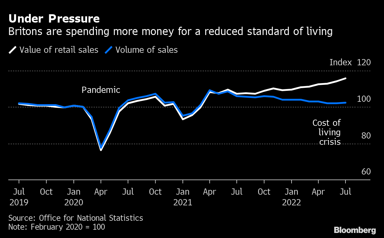 (Bloomberg) -- Britain's surging inflation rate is forcing consumers to pay more for the same amount of goods, underscoring a dimming outlook for the economy.