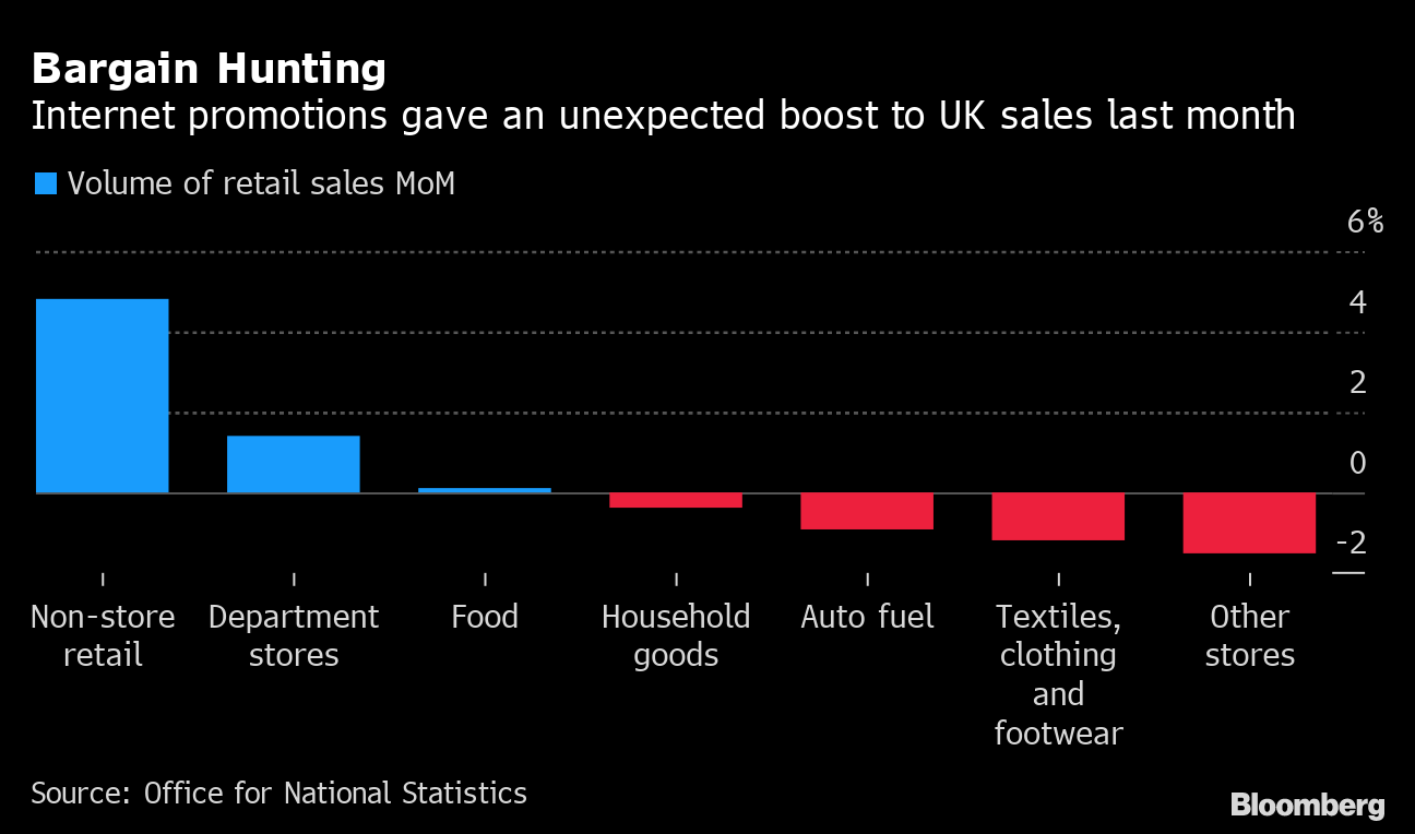 Retail sales volumes unexpectedly rose 0.3% last month, but the cost of those sales increased more rapidly by 1.3%, the Office for National Statistics said Friday. The volume gains came from a 4.8% surge from web-based stores, which offered discounts and promotions to draw in customers.