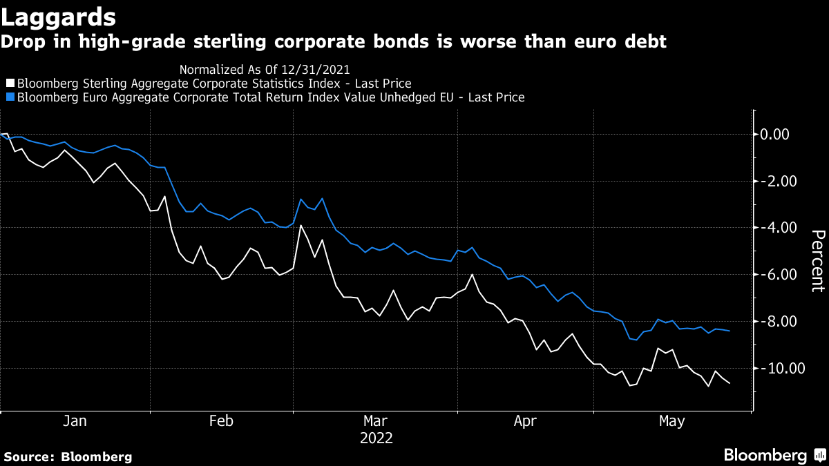 A Bloomberg index that tracks top-rated sterling securities, the bulk of which belong to companies based in the UK, has fallen 11% this year as of Thursday, two percentage points more than euro-denominated debt. The gauge's market capitalization has shrunk £38 billion ($48 billion), the worst year-to-date contraction since at least 2000, which is as far back as the data goes.