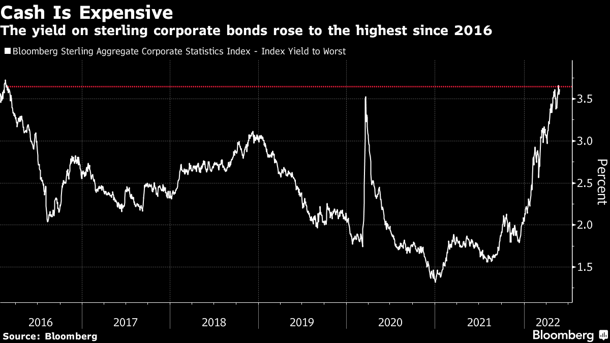 That's because borrowing costs have soared this year, with the yield on sterling high-grade company bonds skyrocketing about 160 basis points to 3.66% in May, the highest since 2016, according to a Bloomberg index. Yields are almost a percentage point above their 10-year average.