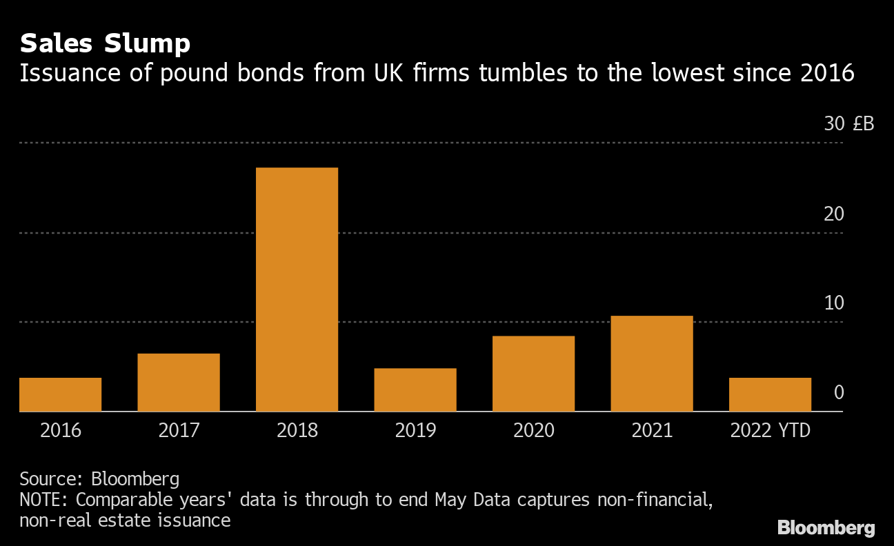 On top of that, the market for new sterling corporate bonds, which is much smaller than its euro and dollar peers, has virtually ground to a halt. Issuance by UK-based, non-financial firms in 2022 is just £3.78 billion, the lowest since 2016 and a third of what was sold this time last year. Companies such as Matalan Ltd. are having to rethink their capital structure, and funding mergers and acquisitions is becoming tricky and expensive.