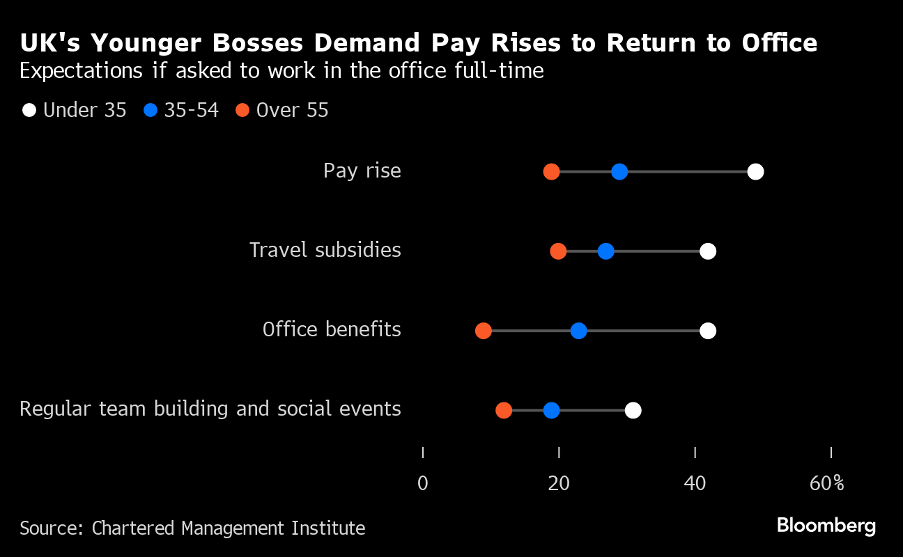 That's more than the average across all age groups and double the number for over 55s, the CMI survey of more than 1,000 UK managers found. Those under 35 are also most likely to demand travel subsidies, regular team gatherings and office benefits such as free lunch to work in the office full time.