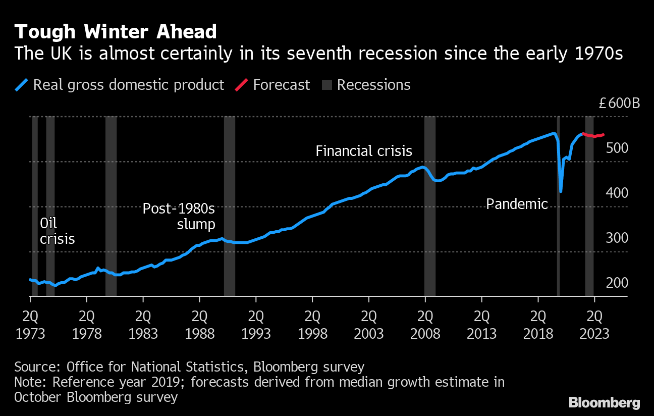 Together, those forces mean the UK probably has already entered a recession. And for the first time in decades, the Bank of England and Treasury are both slamming on the brakes in the face of economic weakness. They're focusing on getting inflation under control after it leaped to a 40-year high, delivering a searing squeeze on living standards.