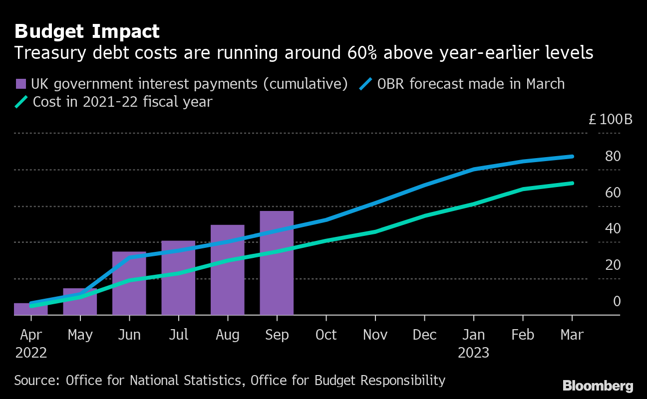 In the first six months of the fiscal year, the Treasury saw its debt-interest bill jump by 64% from a year earlier to £57.1 billion -- significantly more than the country's fiscal watchdog predicted in March.