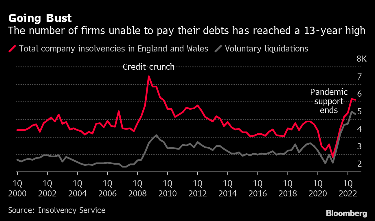 UK companies are having trouble with high interest rates, which come on top of a surge in inflation and energy costs.