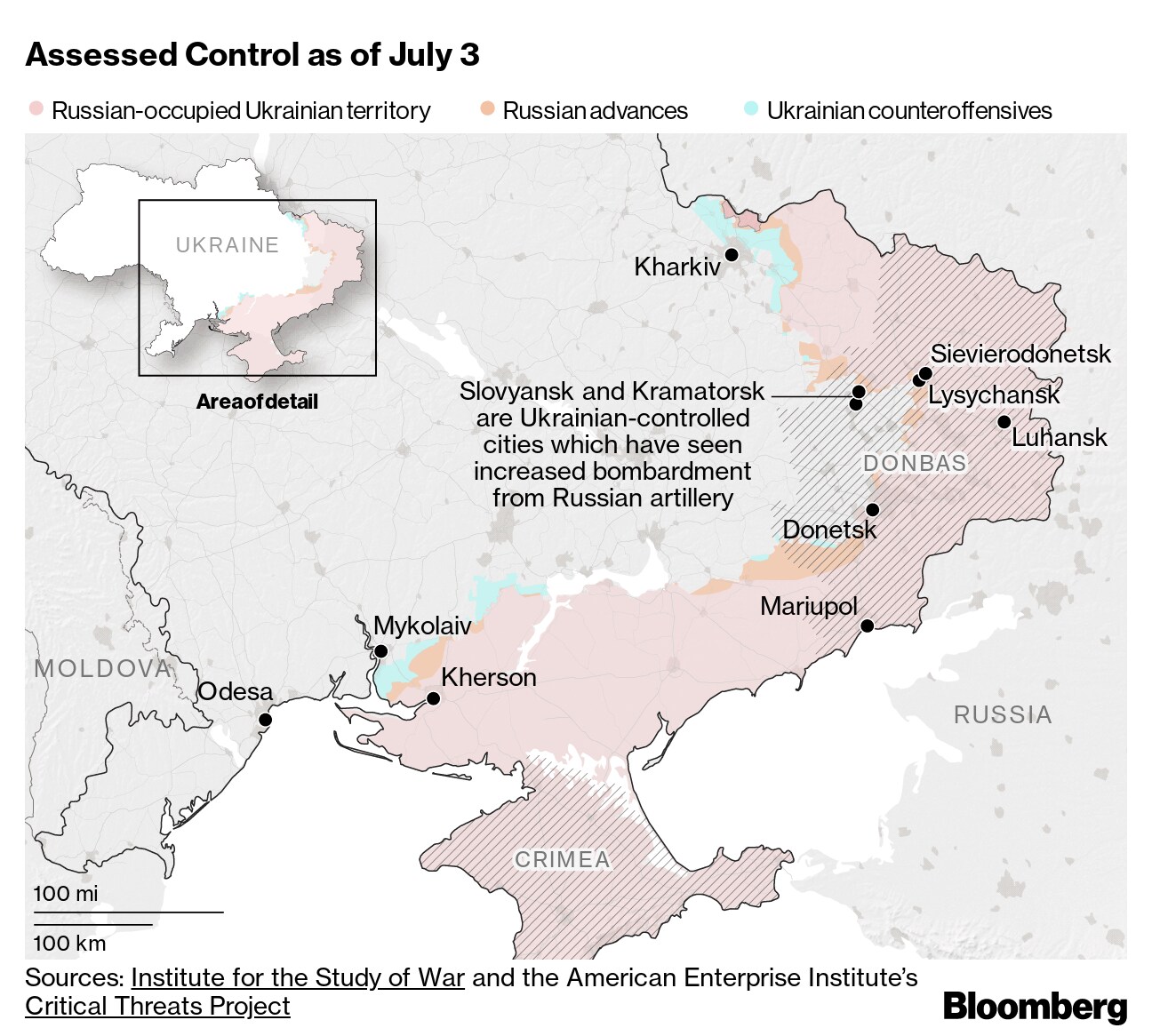 With Lysychansk under its control, Russia is switching its focus further west into Donetsk, intensifying shelling of the region, according to Ukrainian officials. Moscow's forces also hit residential areas, killing nine civilians and wounding 25 there over the last 24 hours. Russia is attempting to blunt counteroffensives by Kyiv's forces in the Kharkiv region in the northeast as well as the Kherson and Mykolayiv regions in the south, the Ukrainian military said.