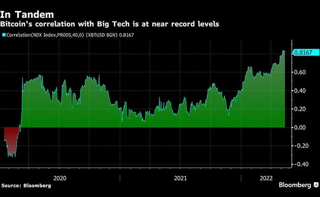 There are other challenges facing cryptocurrencies, not least their tendency to trade more and more like technology stocks. Bitcoin's 40-day correlation with the Nasdaq 100 index currently stands at 0.82, close to a record, data compiled by Bloomberg show. A correlation of 1 indicates that two assets trade in perfect unison; a reading of -1 means they trade in opposite ways.