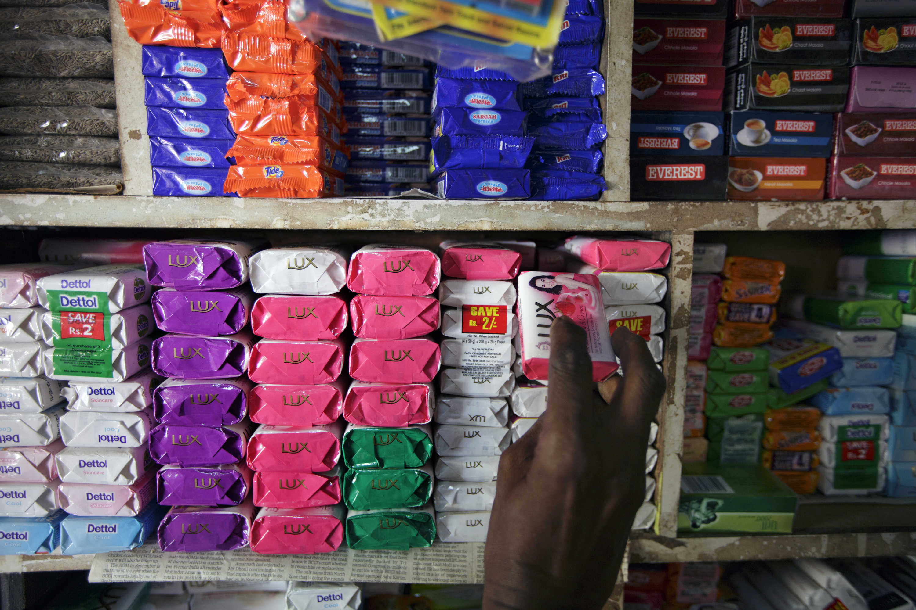 A man takes a bar of Hindustan Unilever Ltd. Lux soap off a shelf at a store. (Photographer: Kuni Takahashi/Bloomberg)