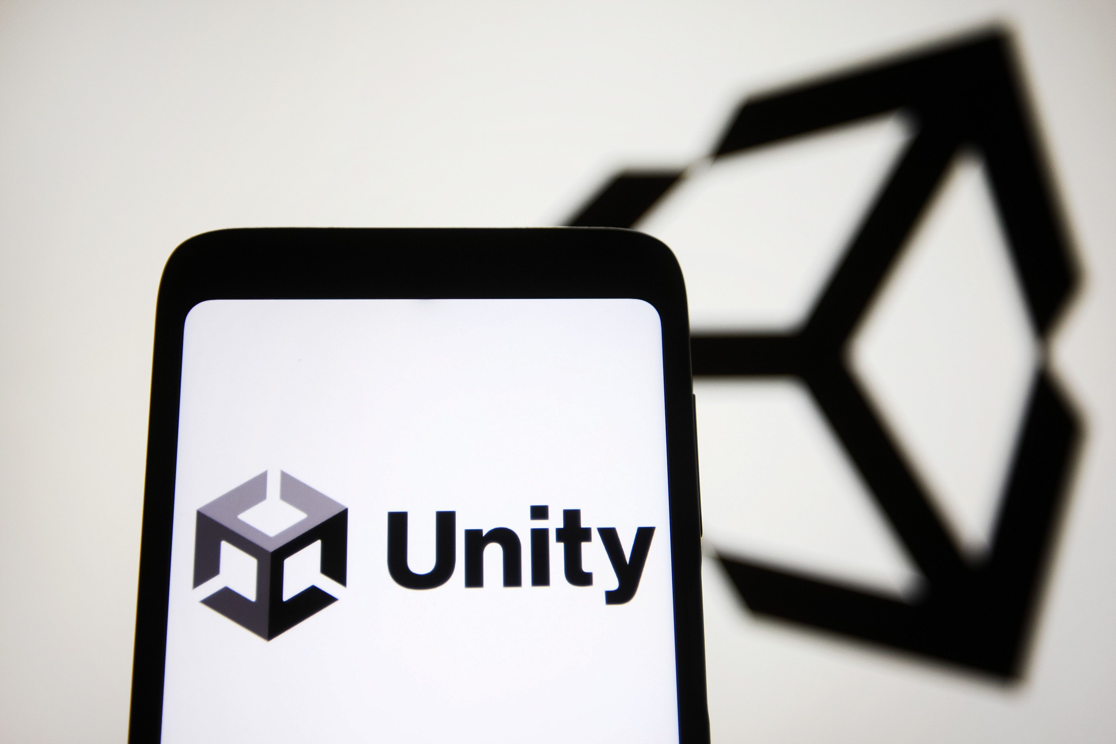 In this photo illustration, the Unity Technologies (Unity Software Inc.) logo is seen on a smartphone screen and in the background. (Photographer: Pavlo Gonchar/SOPA Images/LightRocket/Getty Images)