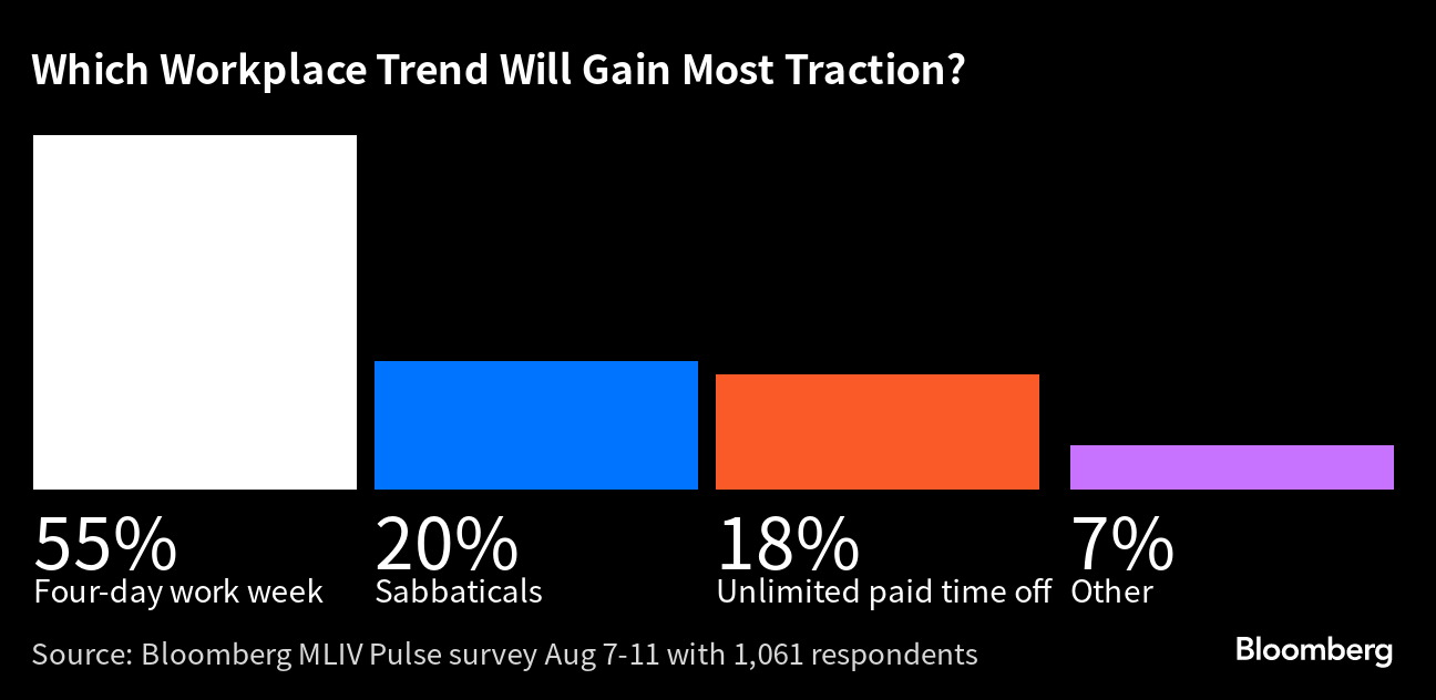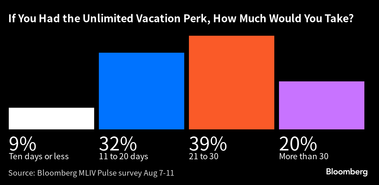 Goldman Sachs Group Inc. made waves last yearĀ when it announced it would rollĀ out unlimited PTO to senior staff. Often associated with Silicon Valley startups, the perk is still relatively rare: only about 8% of companies in the US offer it, according to a 2023 survey by the Society for Human Resource Management. About 12% of MLIV Pulse respondentsĀ said their firm has the policy.