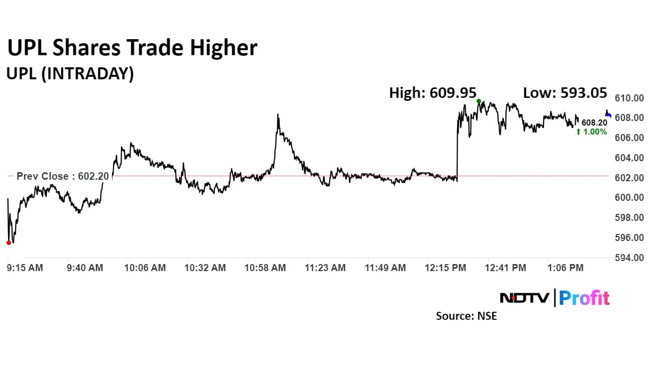 Shares of UPL rose as much as 1.29% during the day to Rs 609.95 apiece on the NSE. It was trading 0.84% higher at Rs 607.2 apiece, compared to a 0.43% decline in the benchmark Nifty 50 as of 1:30 p.m.