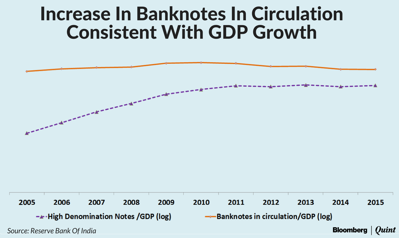 To test that hypothesis, Urjit Patel may have further done a logarithmic growth analysis of GDP, banknotes and high-denomination notes in circulation to test if there was a disproportionate growth in high-denomination notes relative to GDP growth. Again, he would have found nothing alarming or extraordinary in the growth of such high-denomination notes over the last five years, as the government claimed. Over the past decade, the banknotes in circulation have been remarkably consistent with growth in GDP, refuting the government's theory that there is a worrying rise in currency in circulation. He would have surmised that since overall banknotes in circulation have been consistent with GDP growth, any small increase in high-denomination notes is merely a substitution effect from smaller denomination notes.