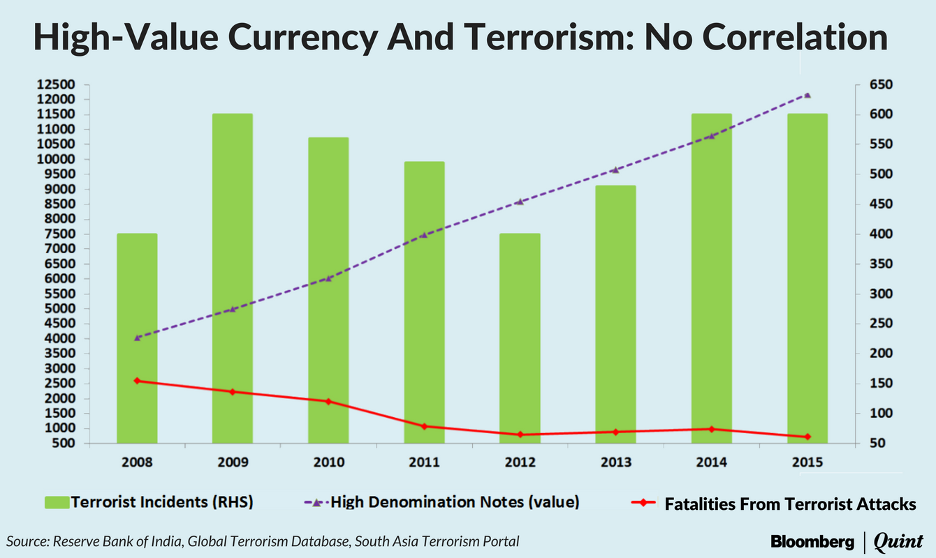 To be sure, he would have also agreed that even a single terror attack and a single fatality on Indian soil is condemnable and needs to be stopped. However, using this dataset, he would have realized that it is very difficult to establish a causal relationship between the number of terrorist strikes on Indian soil and the absolute levels of currency in circulation. Urjit Patel may have thus been perplexed at the government's claim that there is a sudden increase in terror financing due to an increase in high-denomination notes in circulation.