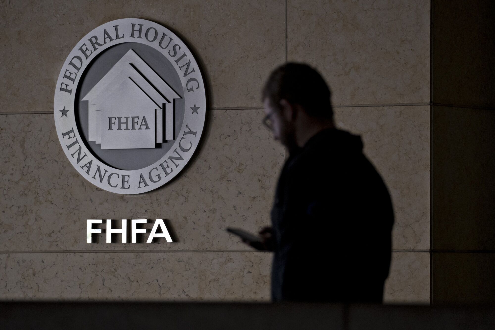 A pedestrian passes the seal of the Federal Housing Finance Agency (FHFA) outside the organization's headquarters in Washington, D.C., U.S., on Wednesday, March 20, 2019. President Donald Trump's pick to lead Fannie Mae and Freddie Macs regulator pledged to work with Congress on overhauling the companies, while downplaying controversial positions he's previously laid out on everything from the 30-year-mortgage to affordable housing initiatives. Photographer: Andrew Harrer/Bloomberg