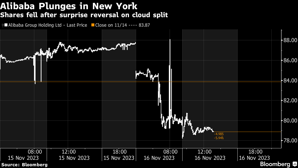 The cloud spinoff was seen as “one of the marquee corporate actions” that would work to reduce the discount of the holding company, Osamu Yamagata at Abrdn said. The planned restructuring bolstered Alibaba's share price, he said, “so I would expect a reversal.”