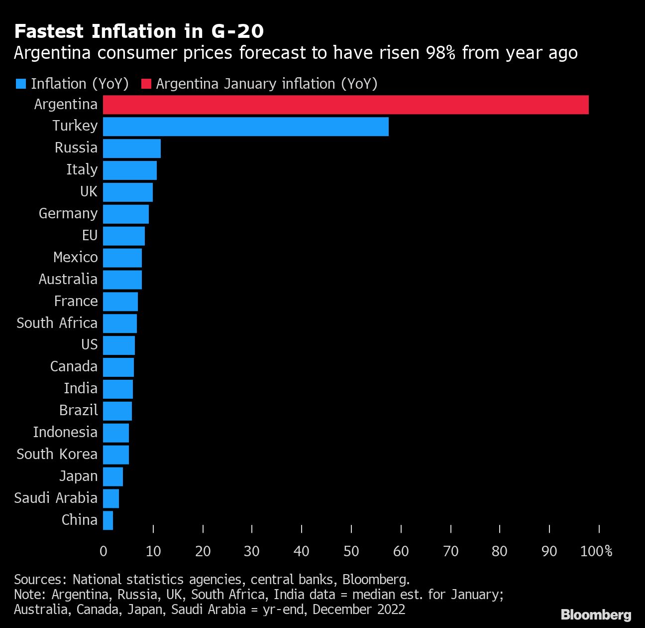 After closing out 2022 at a three-decade high, inflation in Argentina probably accelerated again in January to within a few percentage points of 100%, just above local economists' forecasts for year-end 2023.