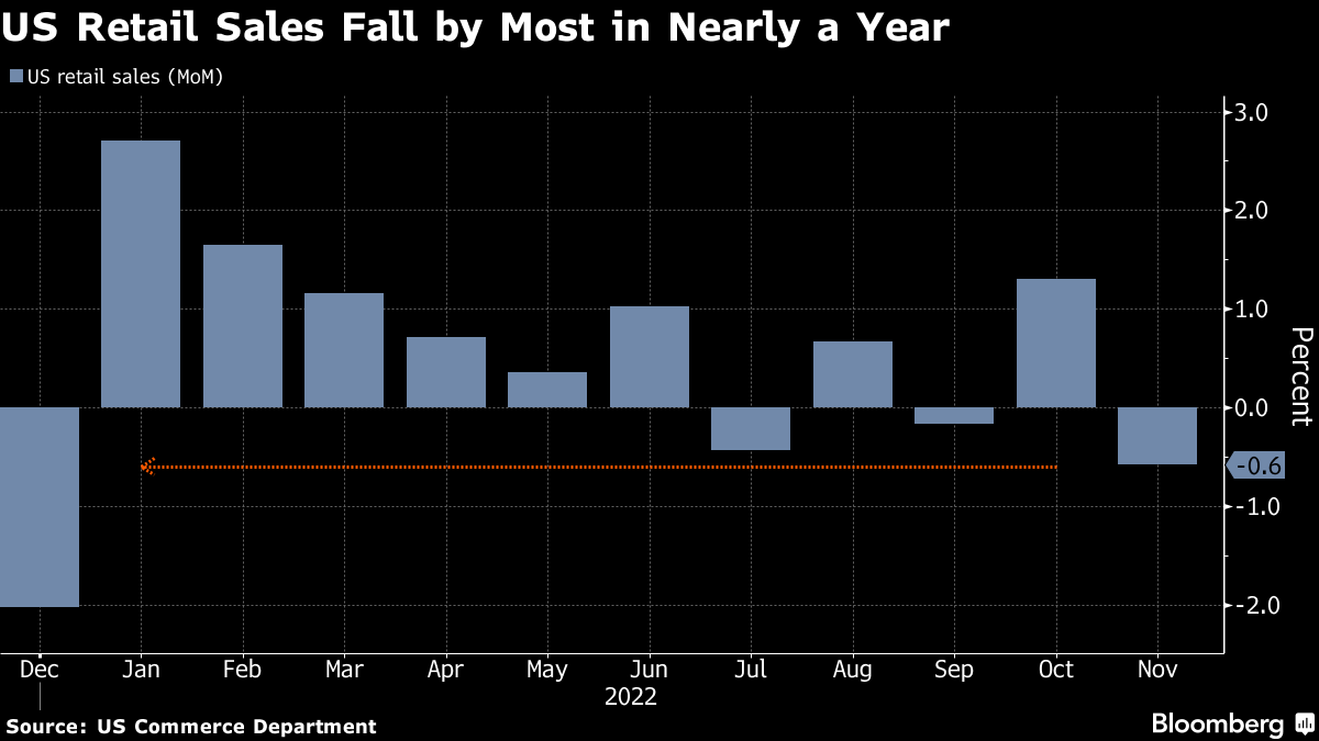 Retail sales fell in November by the most in nearly a year in a broad-based decline reflecting the strain of inflation and a shift toward spending on services. Several factory gauges showed contraction in data out Thursday, burdened by higher borrowing costs and weaker demand.