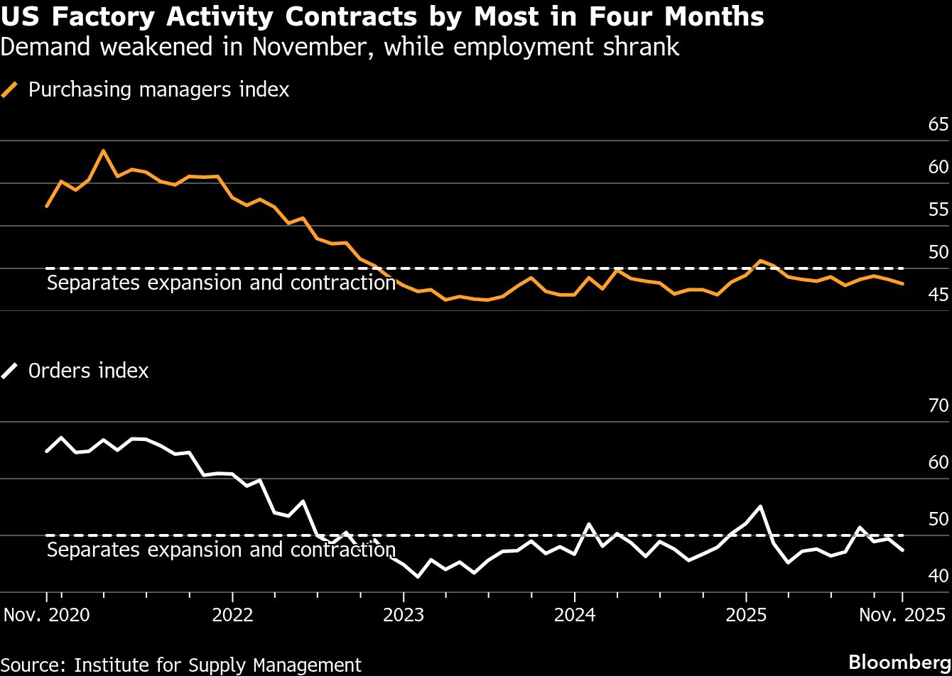 US factory activity shrank in November by the most in four months as orders weakened, indicating manufacturers are struggling to break free from an extended period of malaise.