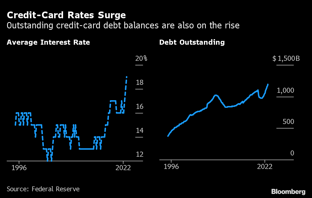 Interest rates on credit cards that averaged 16.3% at the beginning of the year have climbed to just over 19%, according to Bankrate.com, the highest level in data going back to 1985.