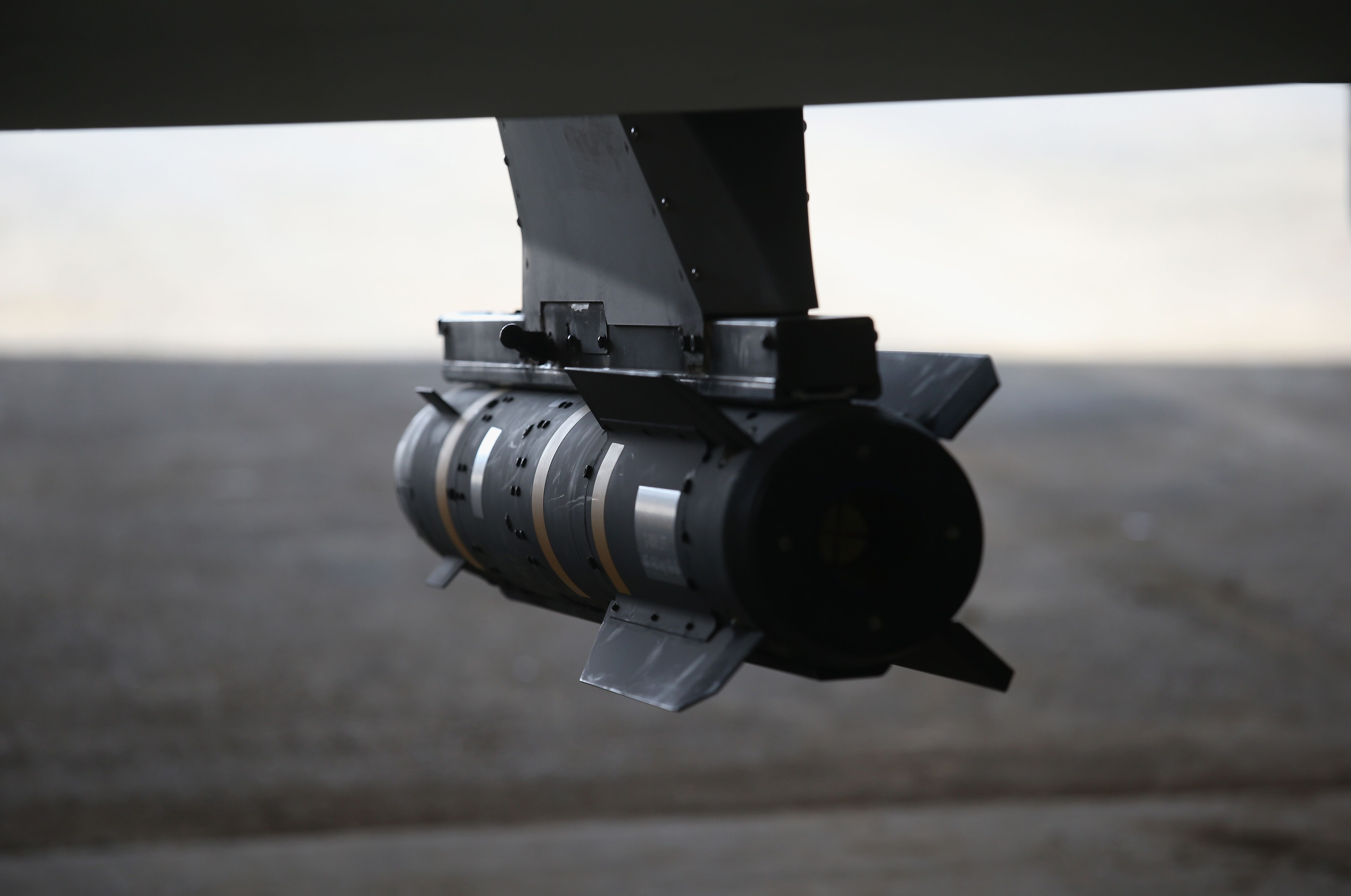 UNSPECIFIED, UNSPECIFIED - JANUARY 07: A Hellfire missile hangs from a U.S. Air Force MQ-1B Predator unmanned aerial vehicle (UAV), at a secret air base in the Persian Gulf region on January 7, 2016. The U.S. military and coalition forces use the base, located in an undisclosed location, to launch drone airstrikes against ISIL in Iraq and Syria, as well as to transport cargo and troops supporting Operation Inherent Resolve. The Predators at the base are operated and maintained by the 46th Expeditionary Reconnaissance Squadron, currently attached to the 386th Air Expeditionary Wing. (Photo by John Moore/Getty Images)