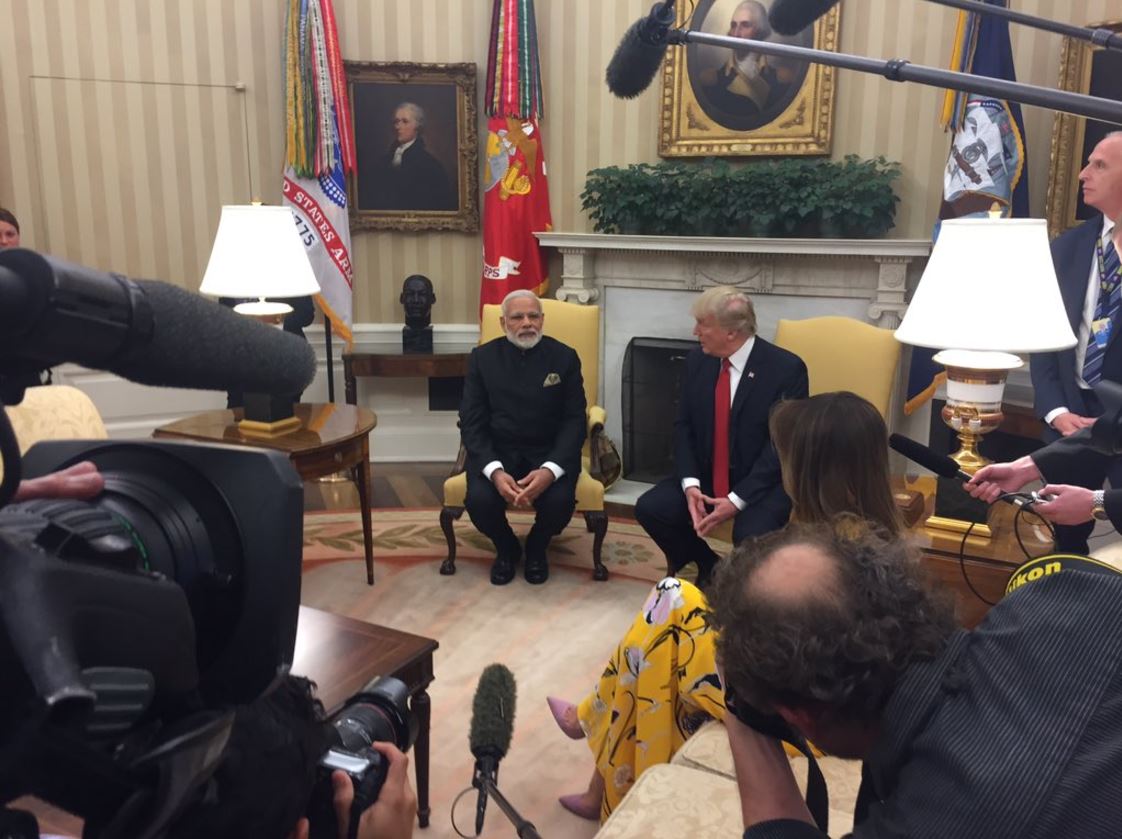 U.S. President Donald Trump and Prime Minister Narendra Modi speak to members of the media in the Oval Office. (Source: @smitaprakash)