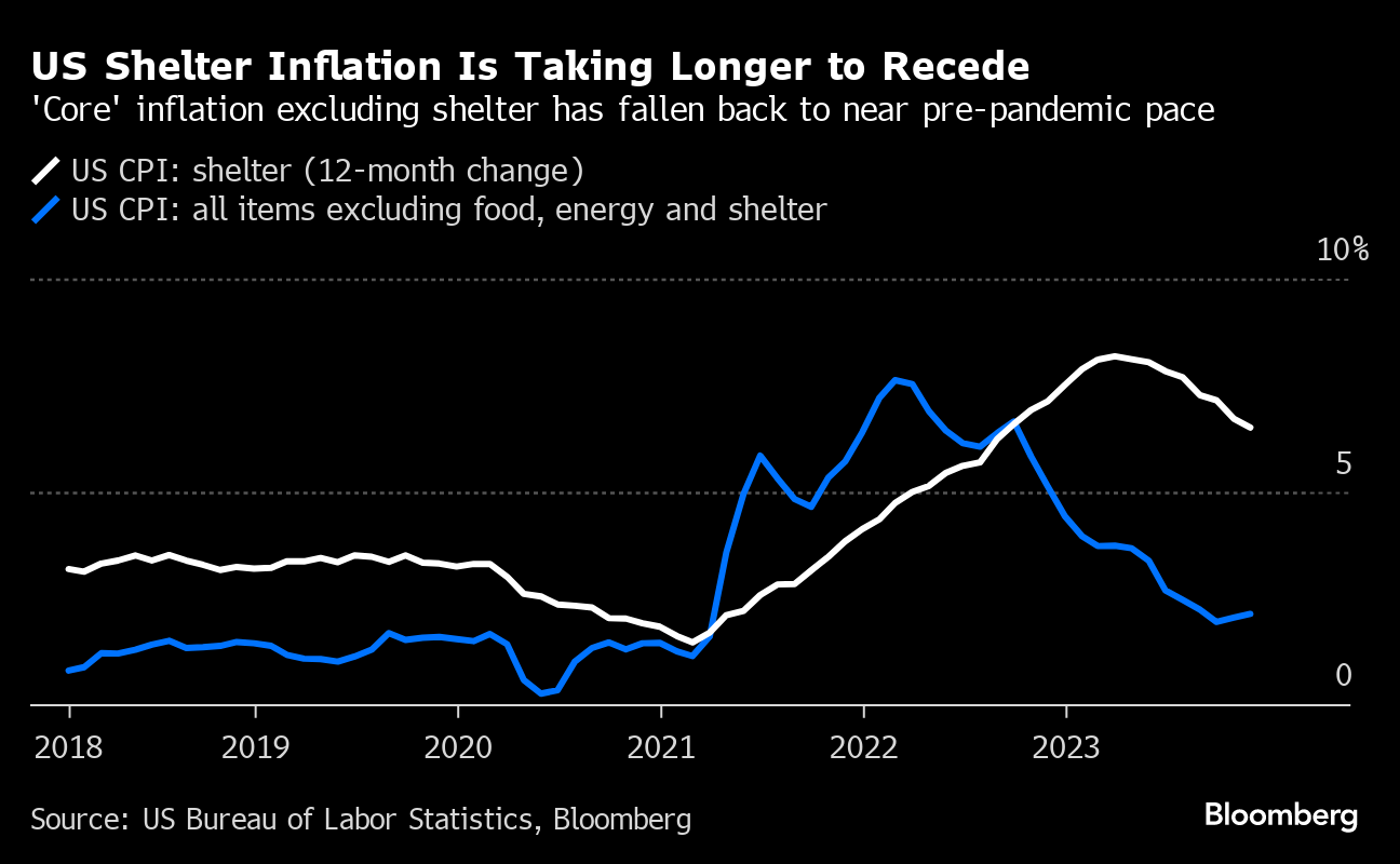 It's since come down, to about 6.5% as of November — and is widely expected to continue decelerating. But progress has been relatively slow, because the shelter component is a lagging indicator that has yet to fully incorporate the slowdown in rent growth during 2023. That's in part because people see a change in their rents only when their lease is renewed or when they move to a new place.