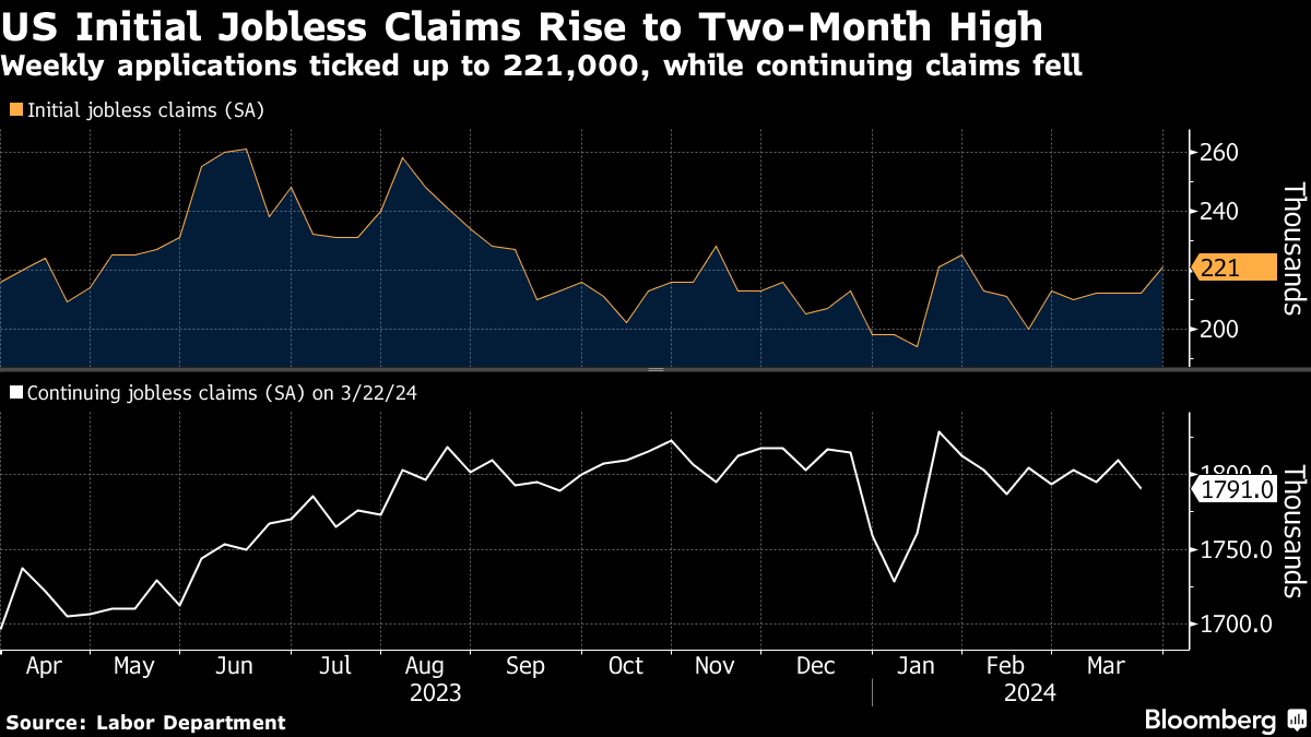 Initial claims increased by 9,000 to 221,000 in the week ended March 30, according to Labor Department data released on Thursday. The median forecast in a Bloomberg survey of economists called for 214,000.