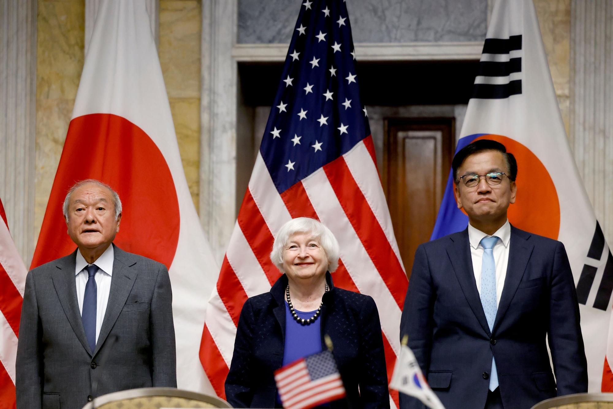 Yellen, Japanese Finance Minister Shunichi Suzuki and South Korean Finance Minister Choi Sang-mok discussed currencies on Wednesday in Washington on the sidelines of the International Monetary Fund-World Bank spring meetings, according to the joint statement released by each side.