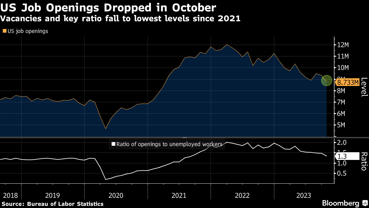 (Bloomberg) -- US job openings slumped in October to the lowest level since March 2021, adding to evidence that the labor market is cooling.