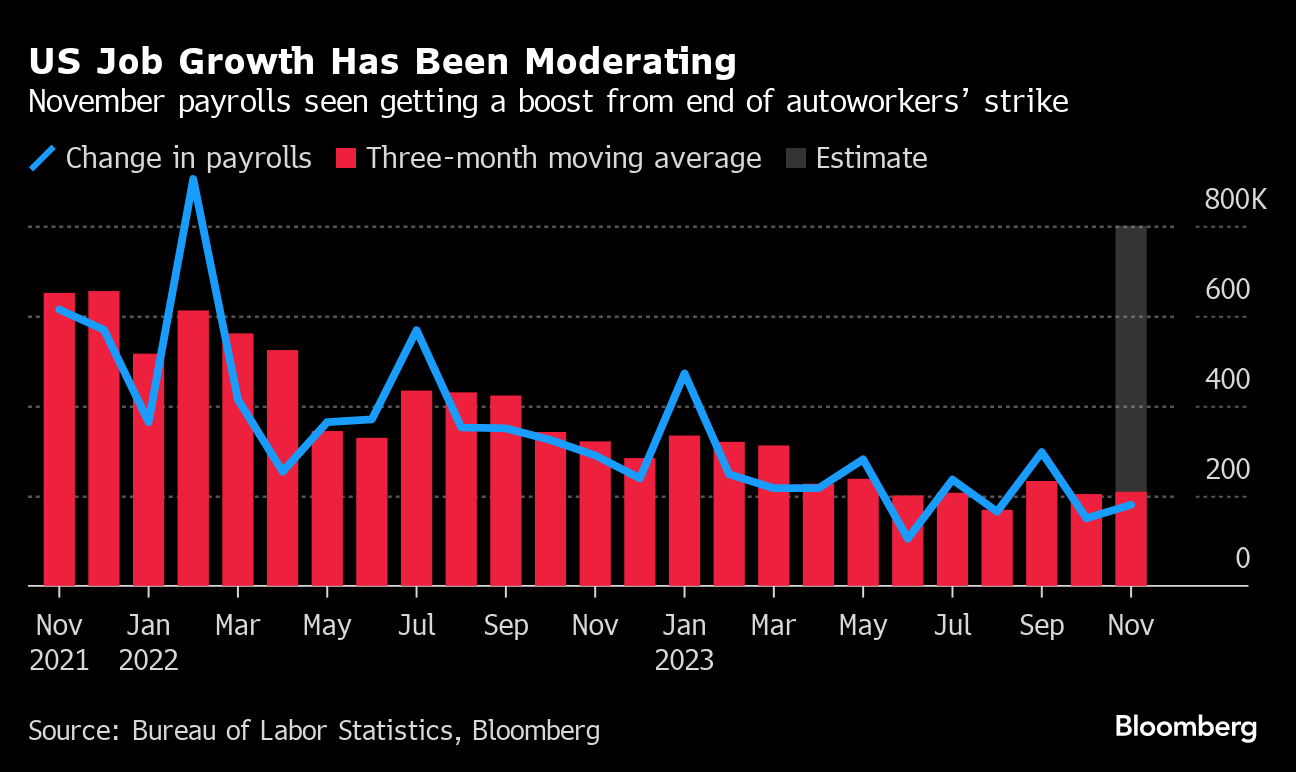 (Bloomberg) -- The return of striking United Auto Workers to vehicle assembly lines is seen driving a pickup in November payrolls, representing a pause in the recent trend of moderating US employment growth.