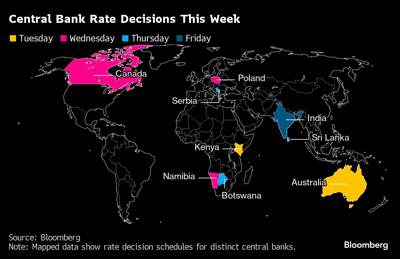 - In Africa, with Kenyan inflation within target, no change is anticipated on Tuesday for a third straight meeting as policymakers monitor a steep depreciation of the shilling.