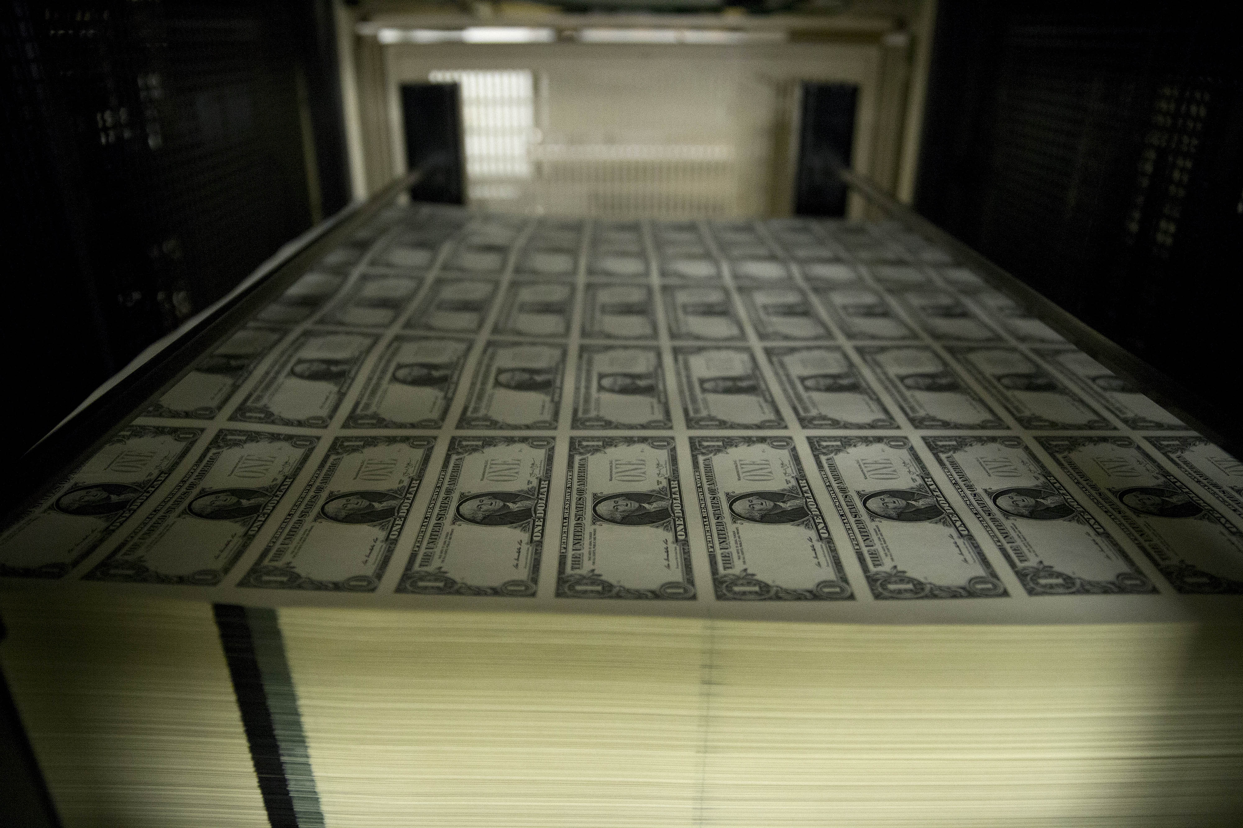 50 subject one dollar note sheets sit in a stack after being printed by an intaglio printing press at the U.S. Bureau of Engraving and Printing in Washington (Photographer: Andrew Harrer/Bloomberg)