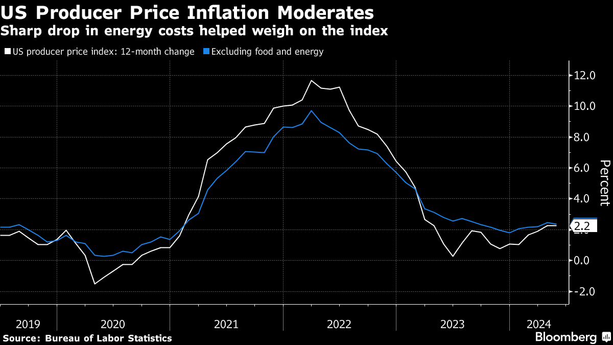 The producer price index for final demand decreased 0.2% from a month earlier, lower than all estimates in a Bloomberg survey of economists. Compared with a year ago, the PPI rose 2.2%, Bureau of Labor Statistics data showed Thursday.