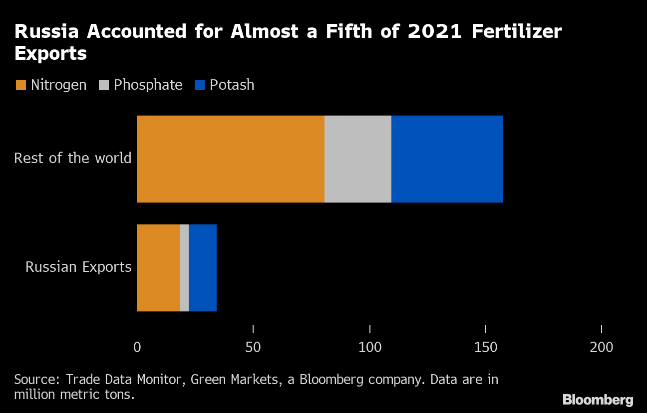 Washington sent a representative to UN-led talks in Moscow earlier this month on the supply issues, according to people familiar with the situation who spoke on condition of anonymity to discuss matters that aren't public. Inadequate fertilizer deliveries this year could also affect next year's crops.