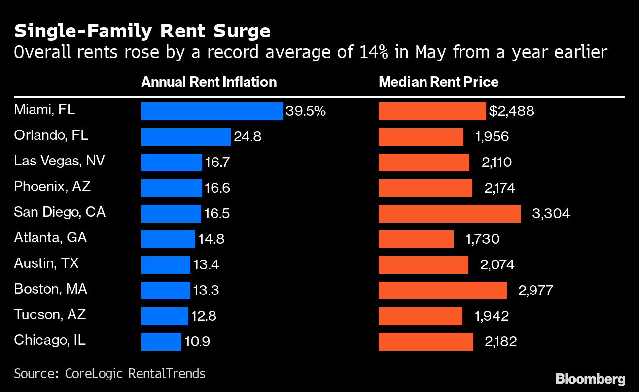 Single-family rents rose by a record 14% nationally in May from a year earlier, according to CoreLogic, a real estate data firm. The increases were even more dramatic in cities that became popular living destinations during the pandemic, including an almost 40% increase in Miami, a 25% rise in Orlando, Florida, and a 17% jump in Phoenix.