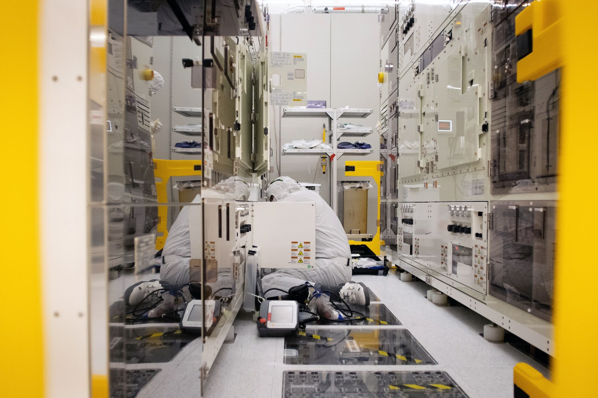 A technician performs tool maintenance work in a cleanroom at the Globalfoundries Inc. semiconductor fabrication plant in Dresden, Germany, on Wednesday, Nov. 30, 2022. As the US has implemented unexpectedly strict rules on the transfer of semiconductor technology to China, the EU has paved the way for chipmakers to receive unprecedented state funds to build production sites as part of its EU Chips Act. Photographer: Liesa Johannssen/Bloomberg