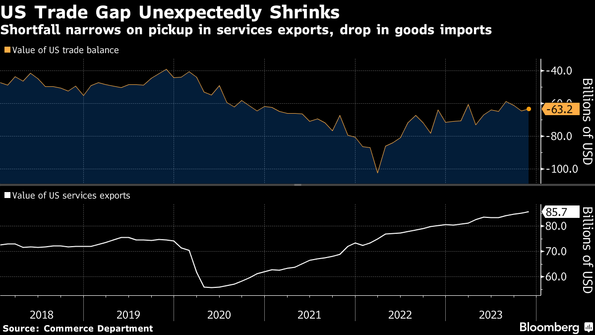The deficit in goods and services trade shrank 2% from the prior month to $63.2 billion, Commerce Department data showed Tuesday. The median estimate in a Bloomberg survey of economists called for a $64.9 billion gap.