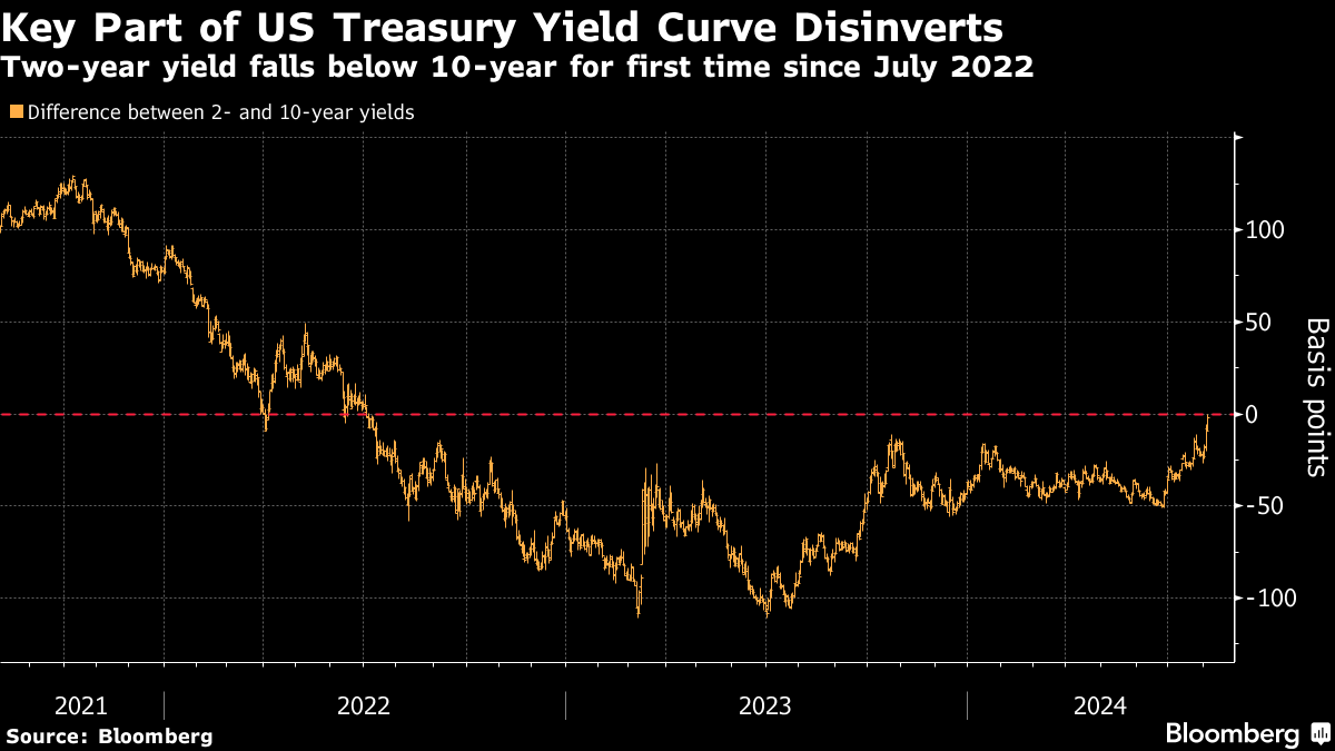 The two-year yield had exceeded the 10-year by as much as 111 basis points in March 2023, the biggest inversion since the early 1980s, according to data compiled by Bloomberg. It reached positive 1.5 basis points earlier on Monday before reverting back to being inverted again.