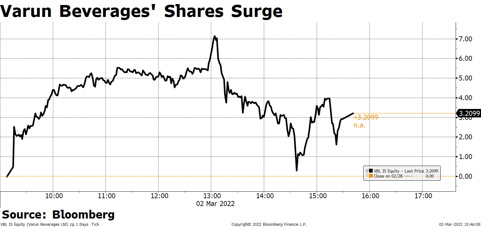 Shares of Varun Beverages Ltd. gained after the company extended its partnership with PepsiCo India Holdings Pvt. to make snacks.