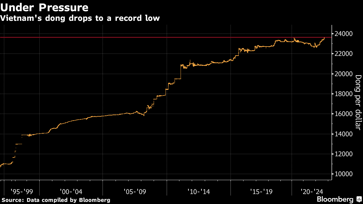 The dong dropped as much as 0.16% to 23,650 per dollar on Friday, the lowest since at least 1993, according to data compiled by Bloomberg. Foreign funds sold a net $46.3 million of the nation's stocks this month.