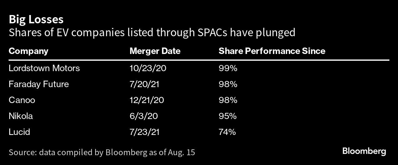 De-SPACs — the term for firms that go public via a SPAC merger — that have made their debut this year have seen a median slump of about 45%, with 18 of them wiping out more than 70% of their value, according to data compiled by Bloomberg.